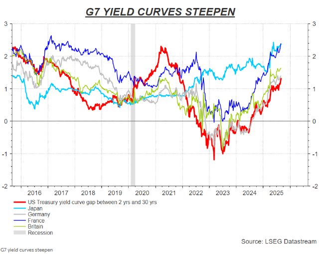 此外,尽管今年欧洲多家央行已启动降息,而美联储暂未行动,但这些举措并未阻止欧洲长期名义借贷利率在本周升至十年高点。事实上,欧洲的收益率曲线如今比美国陡峭得多,而美国的通胀担忧按理说更为严峻。