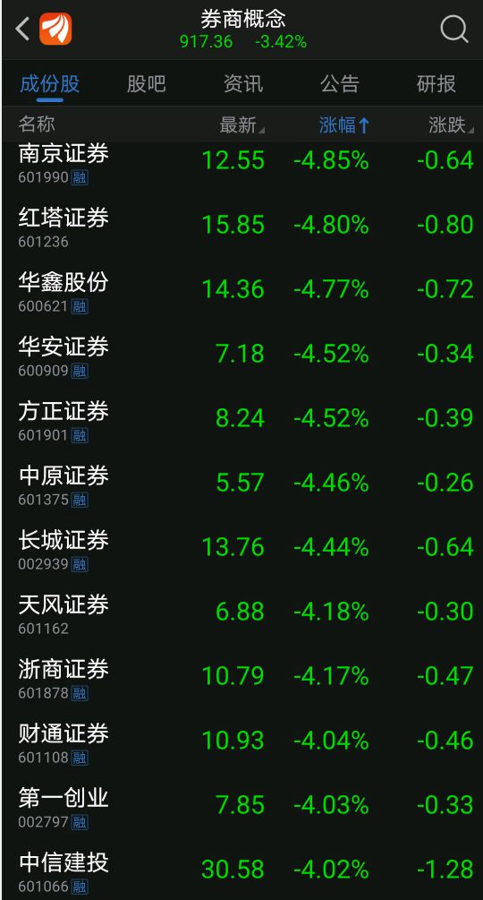 大盘走低,作为市场情绪风向标之一的券商股重挫。券商板块大跌3.42%,其中12只券商股跌幅超过4%。