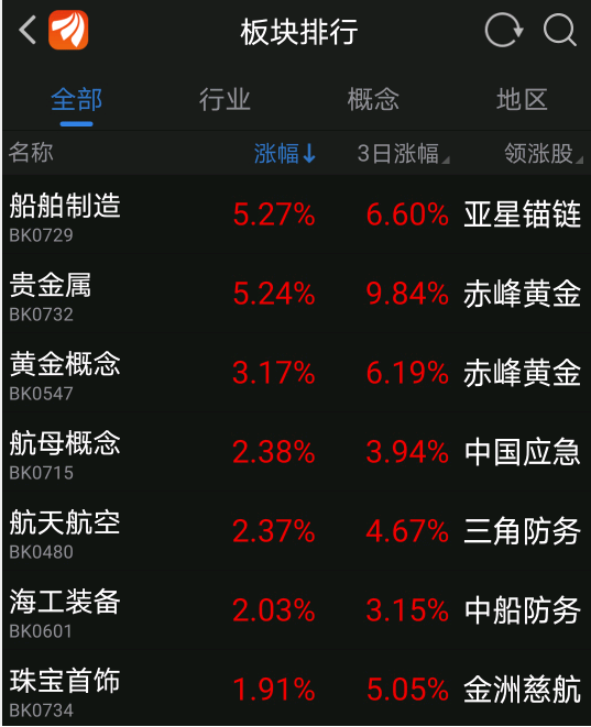 A股市场军工板块如船舶制造、航母概念以及避险情绪相关的黄金、贵金属概念都出现了大涨,其中船舶制造和贵金属概念板块涨幅超过5%。