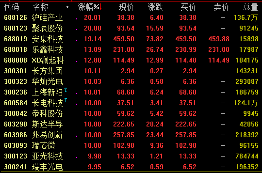半导体板块今日盘中走势强劲,截至收盘,聚辰股份、沪硅产业涨停,安集科技涨逾19%,乐鑫科技、澜起科技涨约13%,长方集团、华灿光电、上海新阳、长电科技、帝科股份、斯达半导、兆易创新、瑞芯微等涨停。