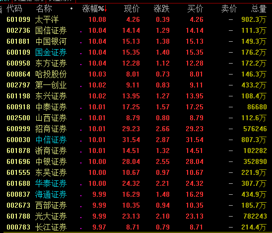 延续强势,券商板块今日再度大幅拉升,个股掀涨停潮。截至收盘,中国银河、国金证券、中泰证券、山西证券、招商证券、浙商证券、中银证券、光大证券等逾20个个股涨停。