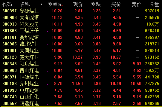 煤炭板块今日盘中大幅拉升走强,截至收盘,安源煤业、大有能源、神火股份、平煤股份、昊华能源、淮北矿业、大同煤业、露天煤业等涨停。