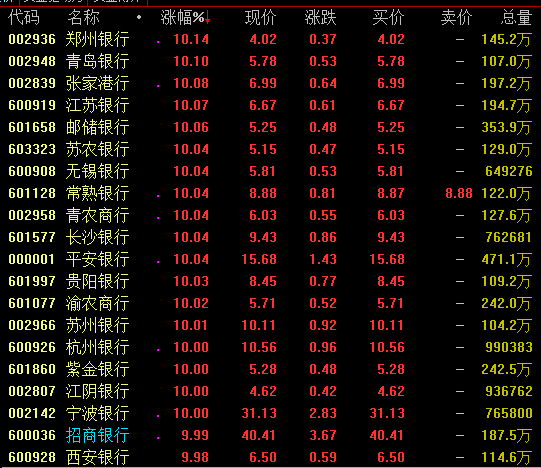 大金融板块今日全线爆发,除了券商、保险板块,银行板块盘中也掀涨停潮。截至收盘,郑州银行、张家港行、邮储银行、中信银行、苏州银行、杭州银行、紫金银行、招商银行、光大证券等逾20只个股涨停。此外,工商银行、建设银行涨幅超8%。