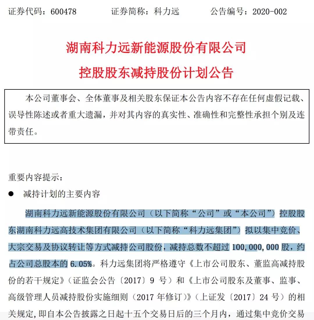 1月14日晚间,科力远发布控股股东减持股份计划公告。科力远控股股东——湖南科力远高技术集团有限公司(下称“科力远集团”)拟以集中竞价、大宗交易及协议转让等方式减持公司股份,减持总数不超过1亿股,约占公司总股本的6.05%。