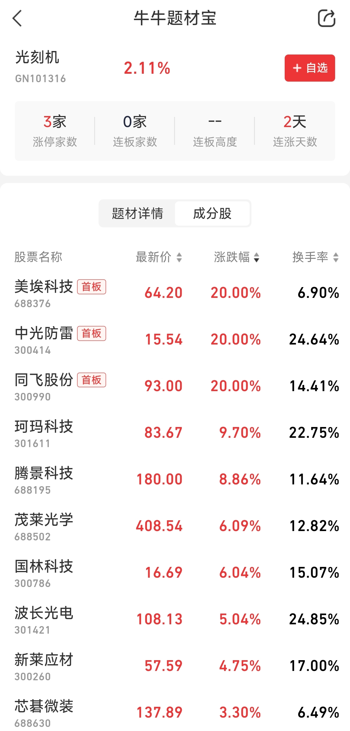 相比之下,半导体设备受销售额历史新高催化,尤其是光刻机很强势,同飞股份、万润股份、东材科技、国风新材纷纷涨停,腾景科技、珂玛科技大涨超10%。