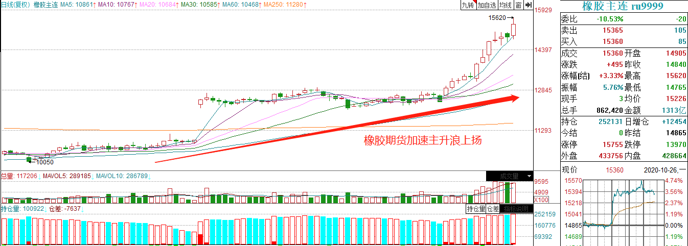 在期货市场中,橡胶这一品种沉寂已久,但国庆后该品种快速启动,短短10余天的涨幅竟然超过了此前一年,10月9日至10月26日的12个交易日里天然橡胶主力合约(天然橡胶2101)累计上涨逾24%。伴随着天然橡胶价格突破15000元/吨,下游轮胎涨价更是一浪更比一浪高。