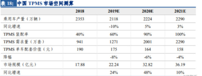 根据长城证券研究,强制法规的出台促使TPMS的渗透率在19-20年快速提升,到2020年将近100%,19-21年中国TPMS市场空间分别为22.24亿元、32.82亿元、36.19亿元,年均复合增速约28%。另根据有关研讨报告推算,到2021年中国汽车市场TPMS芯片需求量将达1.37亿片。