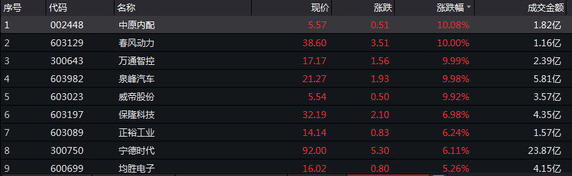 消息一出,汽车板块盘中大幅拉升,截至当日收盘,威帝股份、苏奥传感、恒立实业、泉峰汽车、德宏股份、亚星客车、万通智控、保隆科技等涨停,富临精工涨幅超7%。