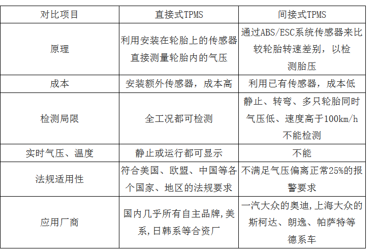 直接式TPMS 能够直接测出轮胎的实际压力,间接式TPMS 监测的是四个轮胎之间的相对压力。直接式TPMS和间接式的最大区别在于,直接式能够检测到哪一只轮胎失压,而间接式不能;间接式TPMS的性能不如直接式,但直接式TPMS的成本相比间接式更高。