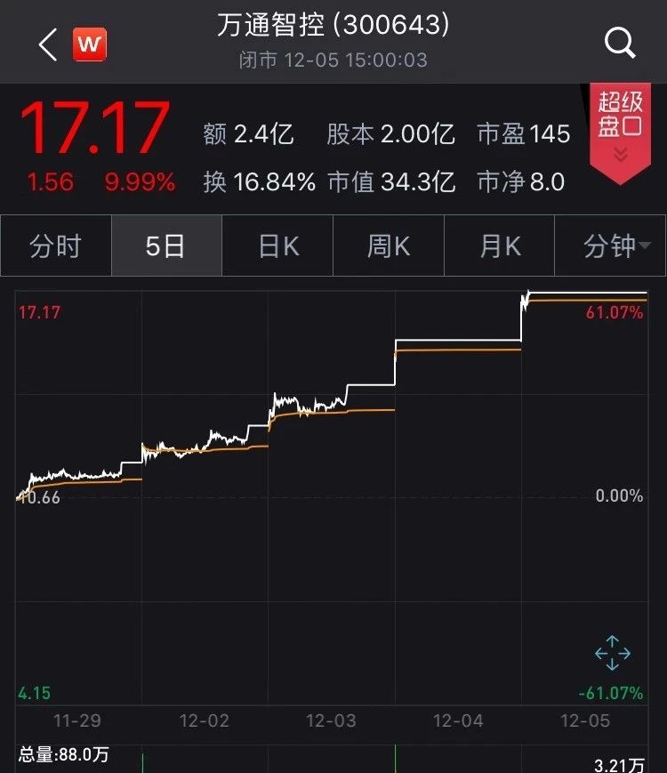 其中,万通智控开盘报16.94元,截止09:45分,该股涨9.99%报17.17元,封上涨停板没市值达到34.34亿元。自11月29日以来,该股已连续五个交易日涨停,股价累计上涨61.1%市值增加近11亿元。截至收盘,该股成交2.39亿元,换手率16.84% 。