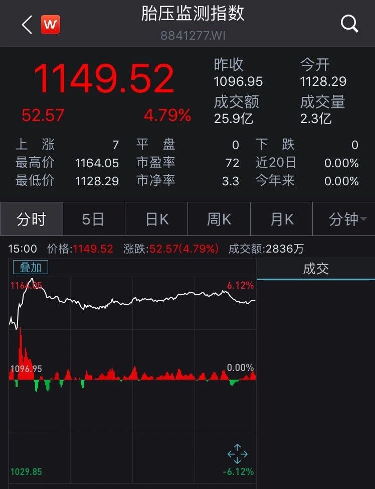 Wind胎压监测指数也是直线上拉,全天涨幅达到4.79%,超过今天两市几大主流指数表现。
