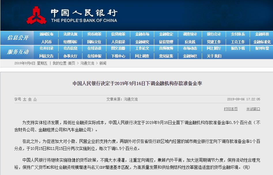 首先是周五,在国常会释放信号后仅仅几天,央行放出大招,9月6日盘后,央行表示,为支持实体经济发展,降低社会融资实际成本,中国人民银行决定于2019年9月16日全面下调金融机构存款准备金率0.5个百分点(不含财务公司、金融租赁公司和汽车金融公司)。