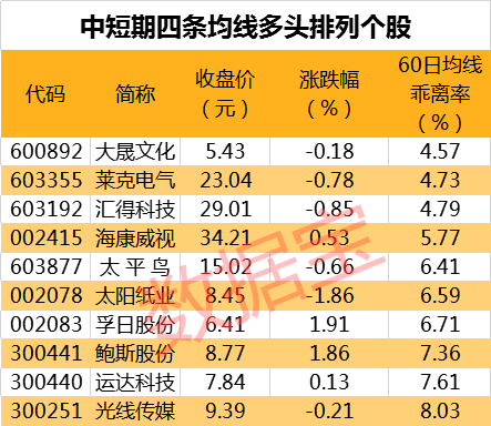 统计显示,截至11月13日,71只个股5日、10日、20日、60日四条均线近日呈多头排列。其中大晟文化、莱克电气、汇得科技股价与60日均线的乖离率最小,分别为4.57%、4.73%、4.79%。