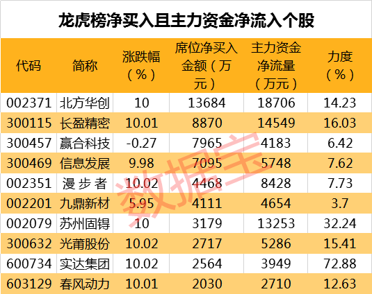 11月13日龙虎榜中机构及营业部席位资金净买入2.66亿元,其中净买入的个股有18只;净卖出的个股有17只。净买入前三名个股分别是北方华创、长盈精密、赢合科技等,净买入金额占当日成交额比例达10.41%、9.77%、12.22%。