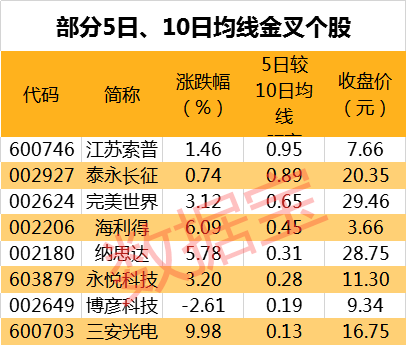 截至最新收盘,有9只A股的5日均线主动上穿10日均线,其中江苏索普、泰永长征、完美世界等个股的5日均线较10日均线距离最大,分别达0.95%、0.89%、0.65%。