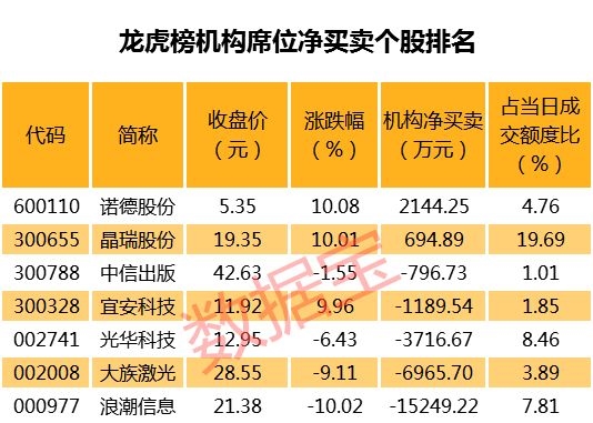 此外,机构净卖出居前个股分别为浪潮信息、大族激光、光华科技等,净卖出金额占当日成交额比例达7.81%、3.89%、8.46%。