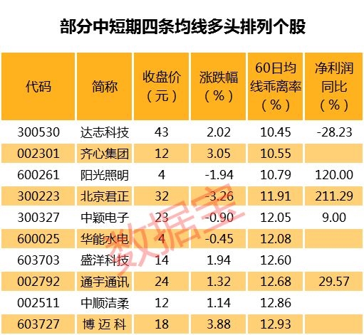 截至周四收盘,36只个股5日、10日、20日、60日四条均线近日呈多头排列。其中达志科技、齐心集团、阳光照明股价与60日均线的乖离率最小,分别为10.45%、10.55%、10.79%。
