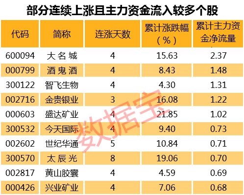 值得注意的是,90只连续上涨个股中,5只个股期间主力资金累计净流入超过亿元。其中,累计资金流入最多的为大名城,主力资金累计流入2.37亿元。