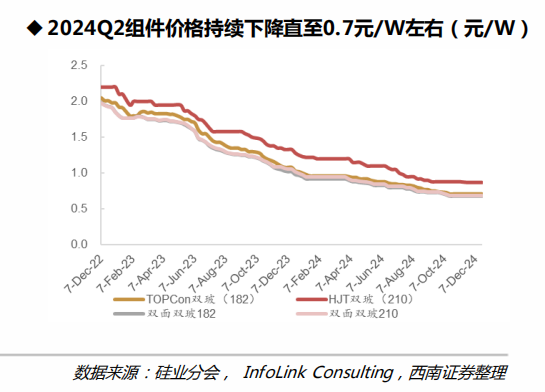 目前光伏组件已经到了全行业亏损的境地。24年10月份以来,在防止内卷式恶性竞争的倡议、CPIA公布一体化组件含税最低成本0.692元/W、主产业链环节初定配额方案、硅料龙头企业减产等多举措出台的背景下,供给有望边际减少。