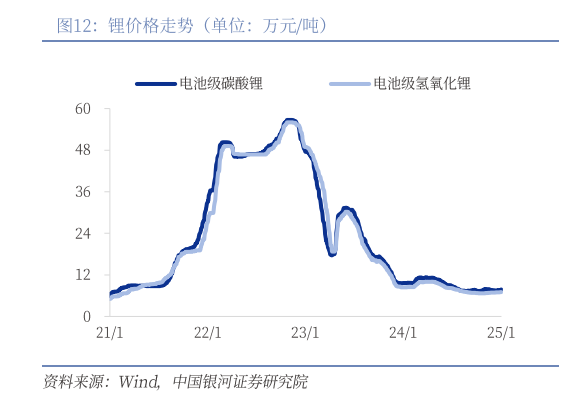 我们以锂价格为例,对比行业的龙头股价,走势方向是基本一致的。2022年初碳酸锂价格在需求旺盛的背景下快速上涨,因为开矿开采需要周期,在这种供需错配下11月达到约60万元/吨的峰值。