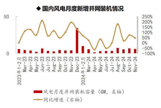 2024年1-11月,国内风电发电装机容量51.8GW,同比增长25.2%;其中8-11 月月度装机分别同比增长180%/20%/74.4%/45.8%,快速增长。海风方面前三季度开工不及预期,四季度海风项目进展恢复,此前开工延期项目有望在后续并网装机,25年及之后海风装机持续性有较强保障。陆风价格在去年四季度有改善。