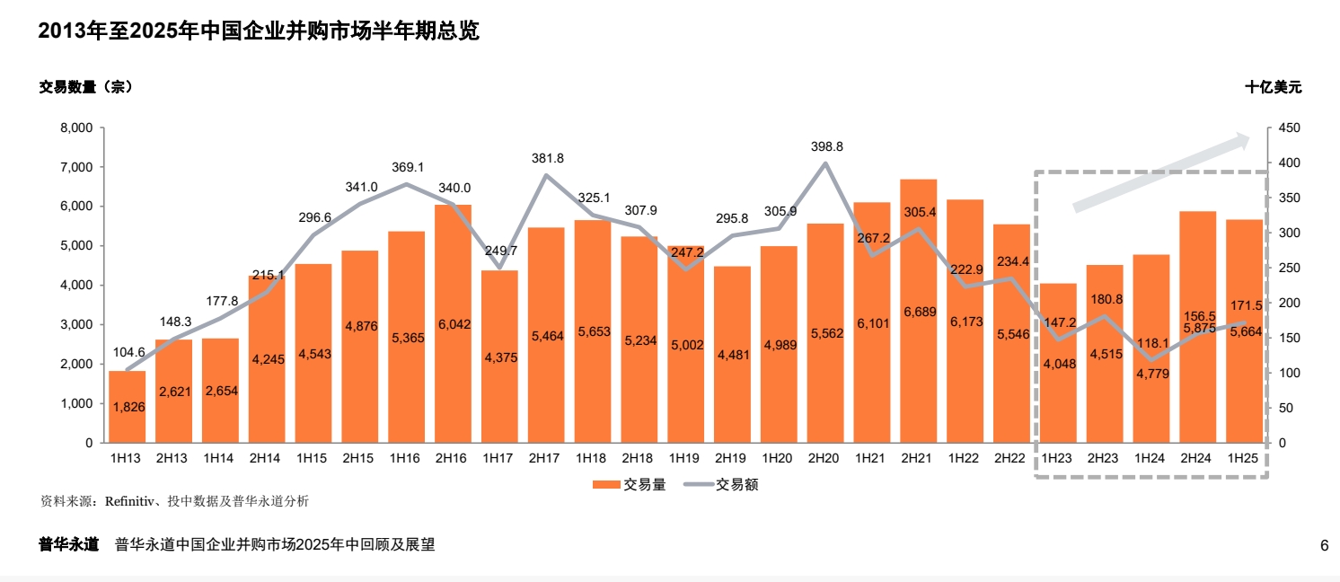 据普华永道8月25日发布的《2025年中国企业并购市场年中回顾及展望》统计,2025年上半年中国企业并购市场披露交易总额超过1700亿美元,较去年同期大幅增长45%。