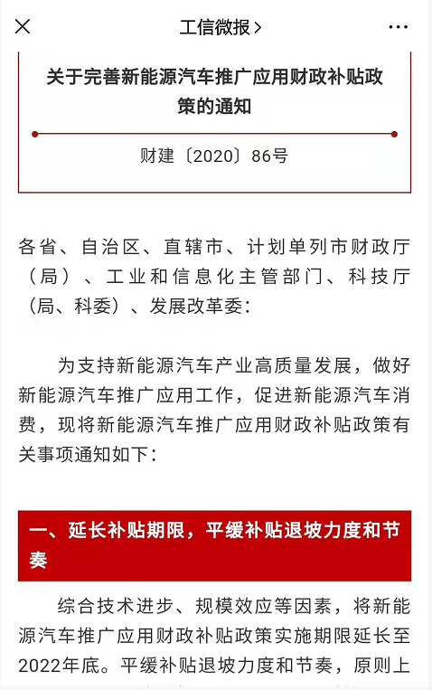 该《通知》规定,将新能源汽车推广应用财政补贴政策实施期限延长至2022年底。平缓补贴退坡力度和节奏,原则上2020 -2022年补贴标准分别在上一年基础上退坡10%、20%、30%。