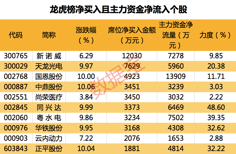 速看!龙虎榜净买入且主力资金净流入个股一览