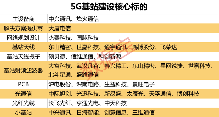 根据券商研报,下面就5G基站建设受益的核心标的做系统梳理。主设备商:中兴通讯、烽火通信;通信解决方案提供商:大唐电信;网络规划设计:杰赛科、国脉科技;基站天线:东山精密、世嘉科技、通宇通讯等;天线振子:硕贝德、信维通信等;射频滤波器:大富科技、武汉凡谷、春兴精工等;PCB:沪电股份、深南科技等;光通信模块:中际旭创、光迅科技、新易盛等;光纤光缆:长飞光纤、亨通光电等;小基站:中兴通讯、日海智能、三维通信等。