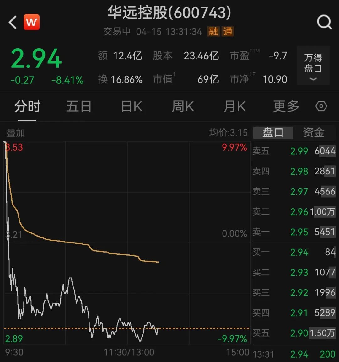 4月15日盘中,华远控股一度触及跌停,上演“天地板”;截至发稿,该股跌超8%,报2.94元/股,成交额达12.4亿元。