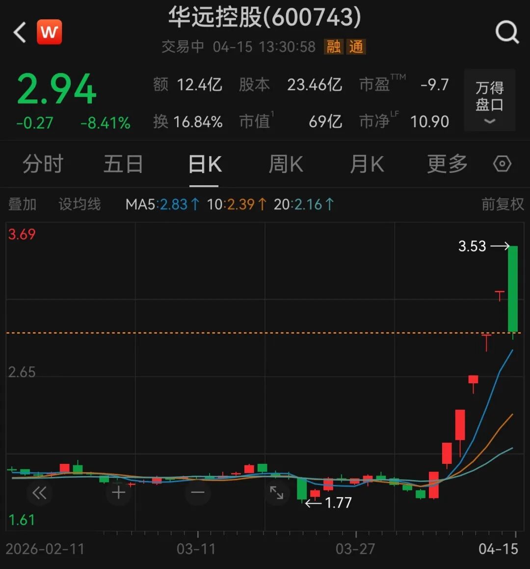 截至4月14日收盘,华远控股股票已连续6个交易日涨停。