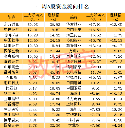 个股方面,剔除近一个月上市的次新股,本周共150股主力资金净流入超亿元,股票数量较上周增长约1倍。互联网金融龙头东方财富主力资金净流入30.03亿元居首,该股本周大涨20.92%,该股今日盘中最高价创下四年来新高。券商行业龙头中信证券主力资金净流入为17.01亿元,本周上涨9.57%。本周净流入规模较大还有的京东方A、中国软件、华泰证券、四维图新、海康威视等。