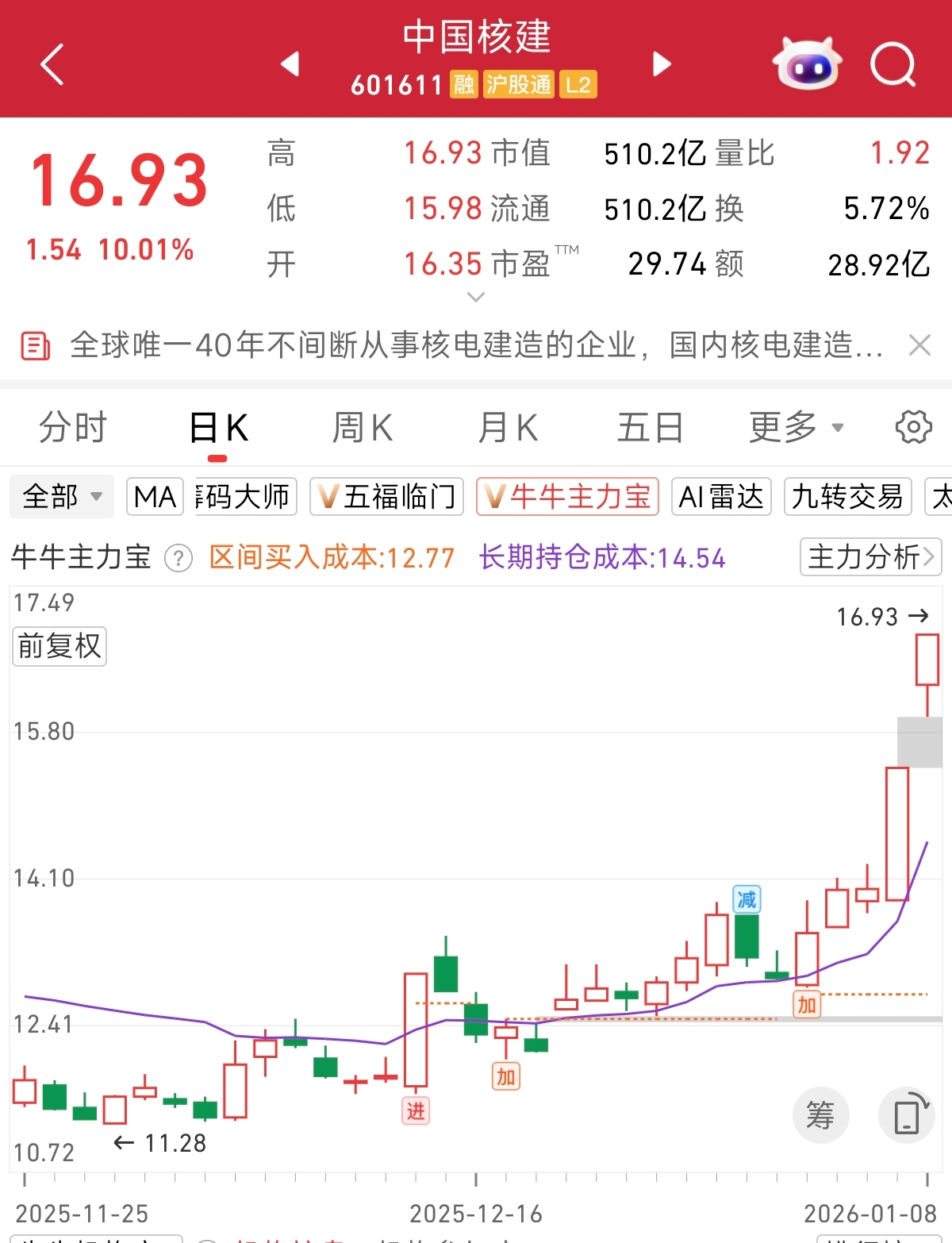 根据“主力宝”监控,可控核聚变铲子股中国核建,主力在12月12日进场,中间进行了1次减仓和2次加仓,目前已经上涨43%。