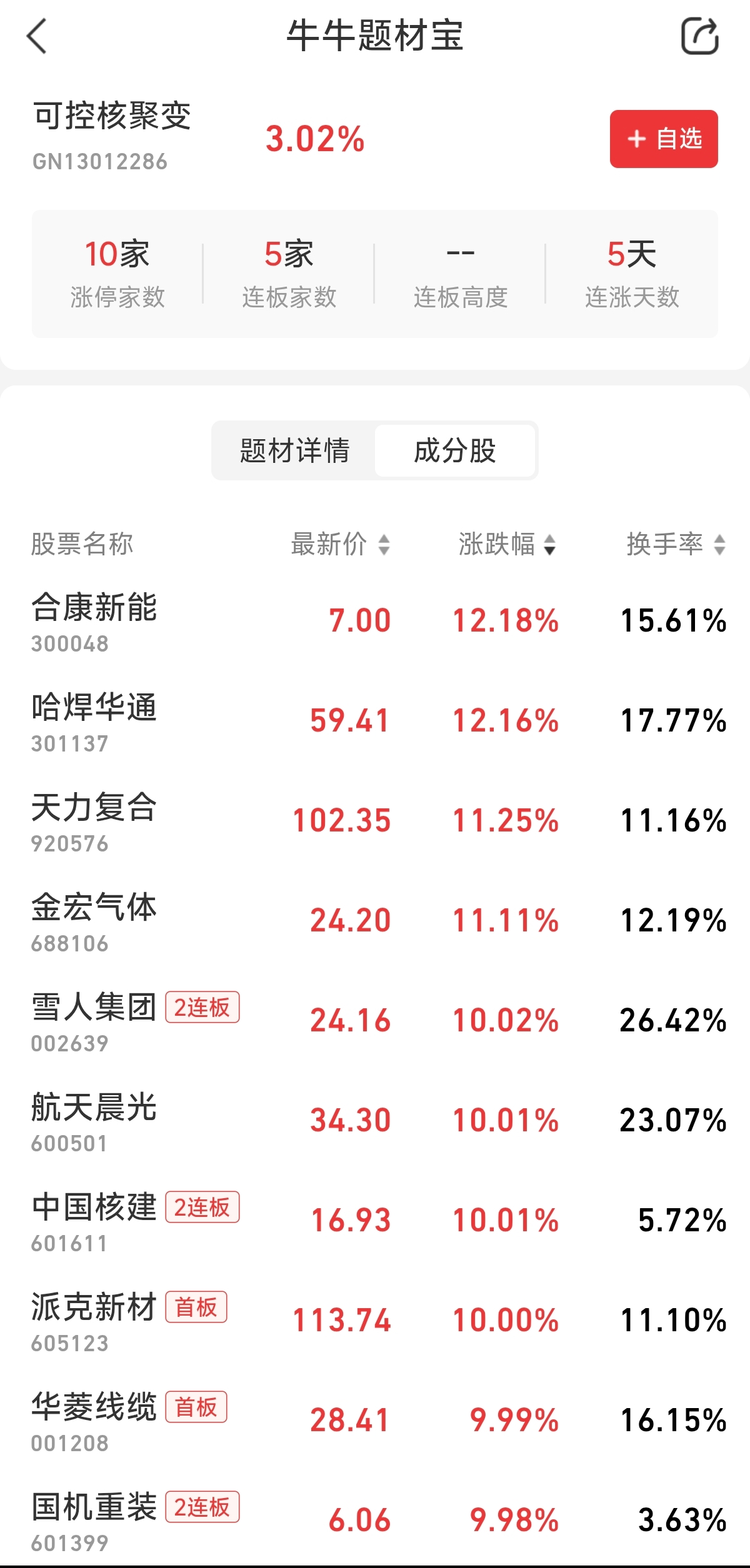 今天重点说一下可控核聚变板块的变化。消息面上,中科院取得了重大技术突破,同时民营聚变公司能量奇点高温超导路线连续运行120秒,系世界上民营公司首次,这给板块带来重大催化。