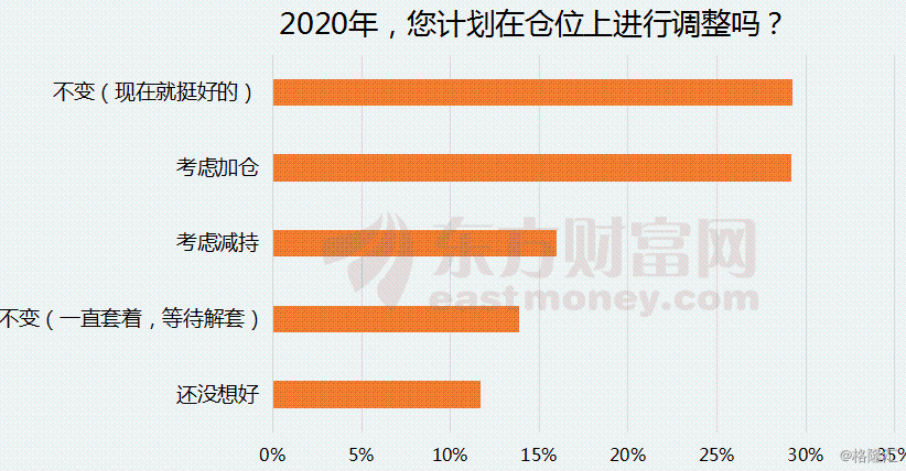 不过,考虑2020年加仓的投资者并不太多。调查显示,29.2%的股民表示2020年会考虑加仓,16%股民表示会考虑减仓。同时,有29.3%的股民称不进行仓位调整,觉得现在就挺好;另外有13.9%股民表示仓位不变,等待解套。