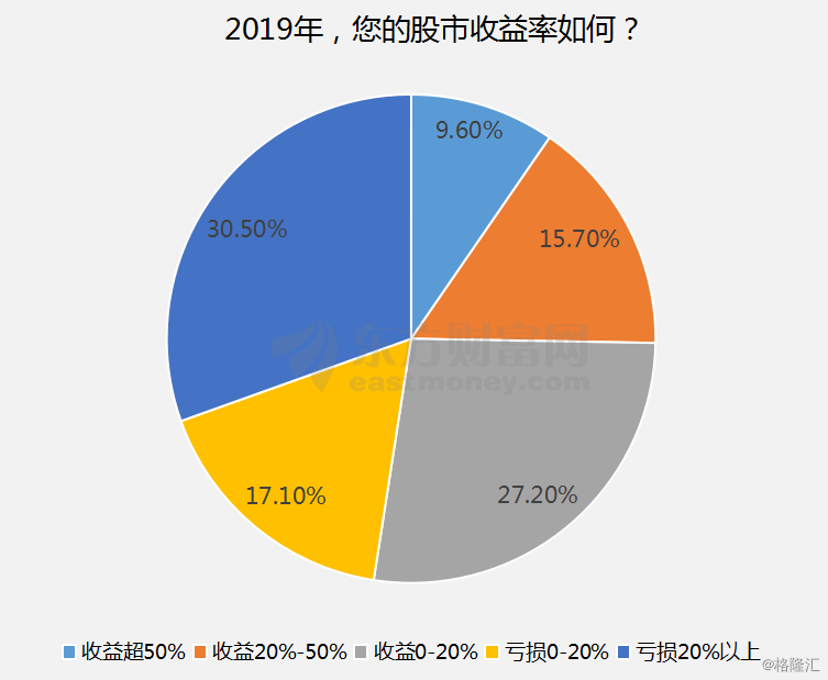 东方财富网12月底进行的网上调查显示,2019年盈利的股民仅52.5%,其中,9.6%盈利超50%;15.7%盈利介于20%-50%;27.2%盈利在20%以内。还有47.5%没有赚钱,其中更有30.5%的股民亏损在20%及以上。