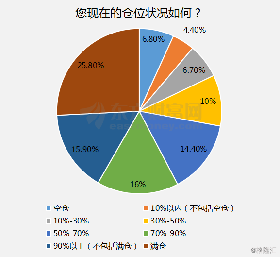 调查结果显示,目前持仓50%以上的股民占72.1%,其中25.8%股民称现在是满仓,只有6.8%的股民表示自己是空仓。