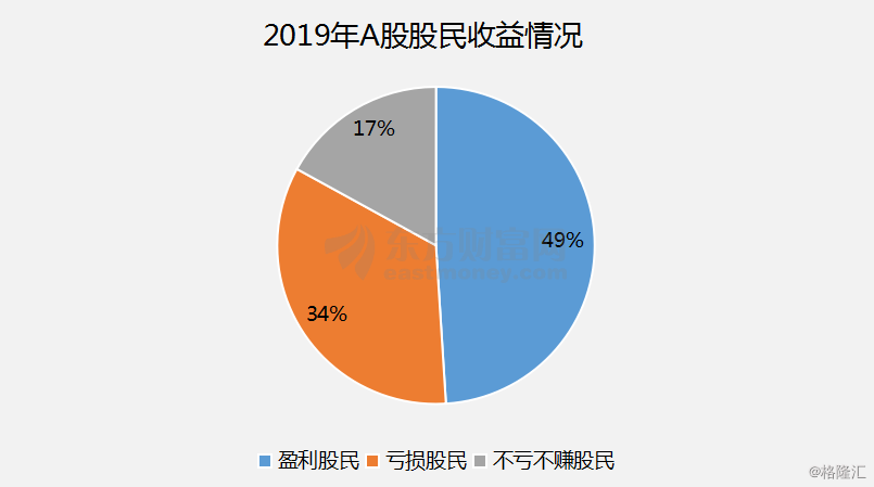 调查显示的盈利比例和证券公司的统计数据接近。东方财富证券账户分析数据显示,2019年49%的股民盈利;34%的股民亏损;17%不亏不赚。