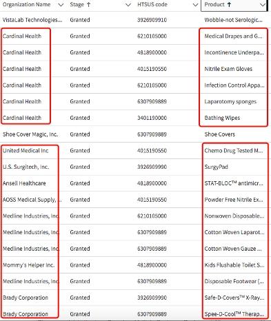 美国贸易代表办公室的文件显示,周四获得此类批准的企业共有27家,包括Medegen Medical Products、Cardinal Health等,获批产品共计有100多种。