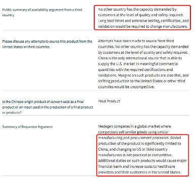 Medegen在向USTR提交的申请文件中表示,现有少数美国制造商的产能有限,难以快速展开并扩大生产规模满足国内需求。按照产品要求的质量和安全级别,(除中国外)没有其他国家或地区有这样的产能。而要更换制造商,也需要较长的交货时间,并进行广泛测试、认证和批准。