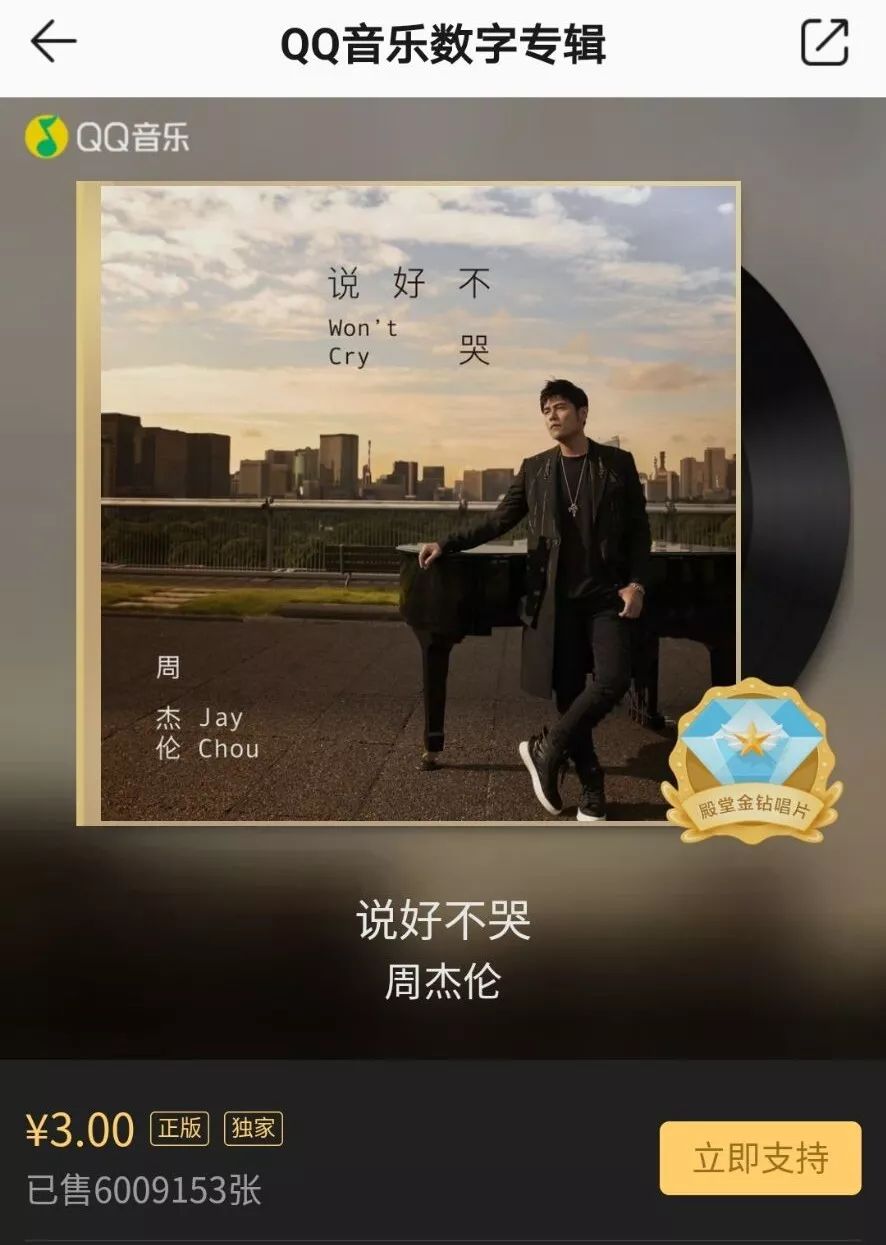 千呼万唤始出来!周杰伦最新数字单曲《说好不哭》昨夜晚间23时正式发布,售价3元,上线约两小时,在QQ音乐、酷狗音乐、酷我音乐三个平台销售额突破1000万元。