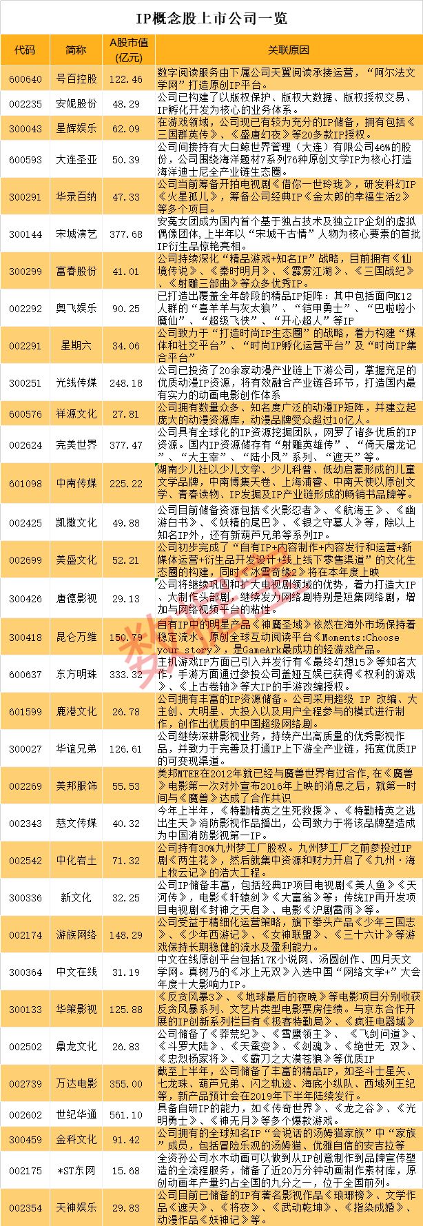 证券时报·数据宝统计显示,类似完美世界这样,拥有超级IP或业务涉及IP领域的A股公司有30余家。以奥飞娱乐为例,公司旗下拥有原创动力、狼烟动画、太极鼠等10多个原创动漫工作室,已打造出覆盖全年龄段的精品IP矩阵:其中包括面向K12人群的“喜羊羊与灰太狼”、“铠甲勇士”、“巴啦啦小魔仙”等IP;面向青少年以及全年龄段人群的“十万个冷笑话”、“端脑”、“雏蜂”、“镇魂街”等IP。