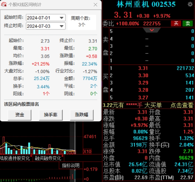 二级市场上,截至今日收盘,林州重机录得三天两板,累计涨21.25%。