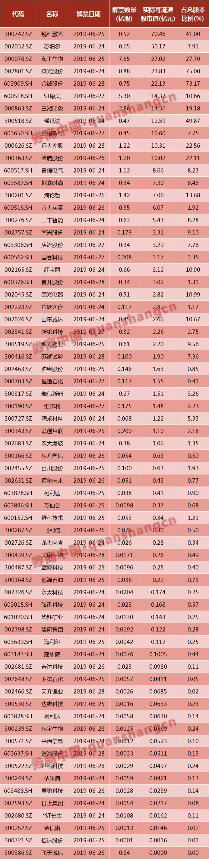 数据显示,本周(6月24日-6月28日)共有67家公司限售股陆续解禁,合计解禁量32.50亿股,按6月21日收盘价计算,解禁市值为346.19亿元,较上周600.16亿元的解禁市值环比减少42.32%。