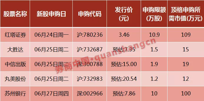 本周共有5只新股申购,分别是红塔证券、大胜达、中信出版、丸美股份、苏州银行,申购代码分别是780236、732687、300788、732983、002966。