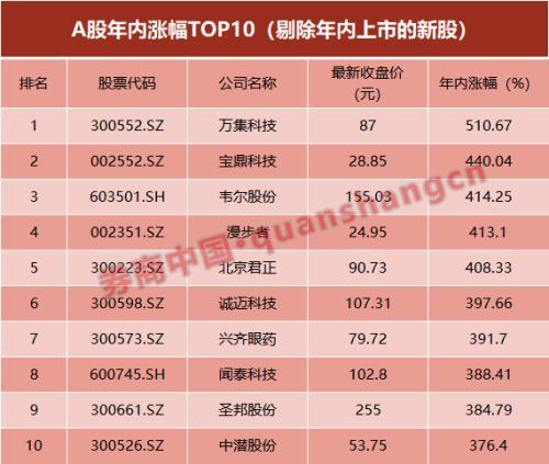 剔除新股年内涨幅排名前十的个股分别是:万集科技、宝鼎科技、韦尔股份、漫步者、北京君正、诚迈科技、兴齐眼药、闻泰科技、圣邦股份、中潜股份。其中万集科技以510.67%的年内涨幅占据榜首。