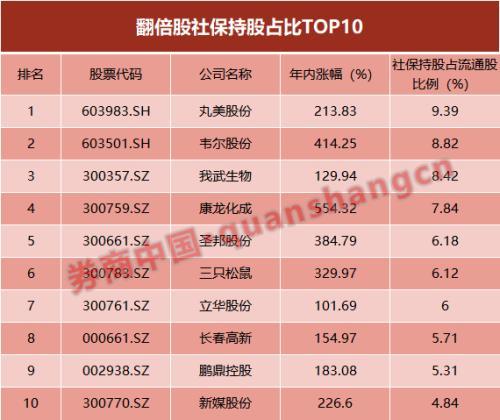 年内翻倍的个股中,社保在65只个股上有持股,持股占比前十名除丸美股份、韦尔股份和我武生物外,还有康龙化成、圣邦股份、三只松鼠等一批牛股。