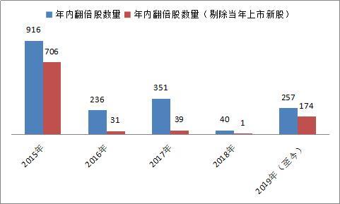 如果进一步剔除今年上市的新股,年内翻倍的个股数量达到174家,这一数量已大大超过之前3年的表现。2018年满足这一条件的个股仅1家,被业内誉为结构性牛市元年的2017年,达到标准的个股也只有39家。可以看到,今年A股市场的赚钱效应较前几年已明显好转。