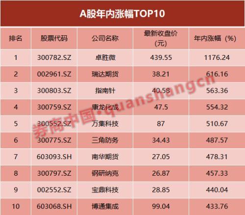 今年A股市场的最牛个股非卓胜微莫属,这家今年6月18日才上市的公司,股价从上市发行价的35.29元一路飙升至最新近440元,短短半年时间就飙涨10倍,令人瞠目结舌。从年内涨幅排名看,除卓胜微外,瑞达期货、指南针、康龙化成(港股03759)、万集科技、三角防务、南华期货、钢研纳克、宝鼎科技也挤进前十。