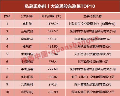 券商中国记者根据最新前十大流通股股东名单整理发现,在牛股的股东名单上,私募基金的身影也频频出现,其中不乏一些今年的明星私募。比如卓胜微,盘京投资持股35.6万股;君如资产在三角防务和中国卫通这两只牛股中均有布局;今年的明星私募前海正帆通过重仓济民制药,取得惊人业绩;私募持股年内涨幅排名前十的公司里,福莱特得到了知名私募从容投资的眷顾。